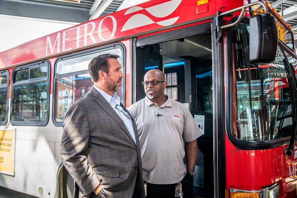 Sean McBride, executive director of Metro Transit, left, speaks with Coach Operator Michael Jackson.