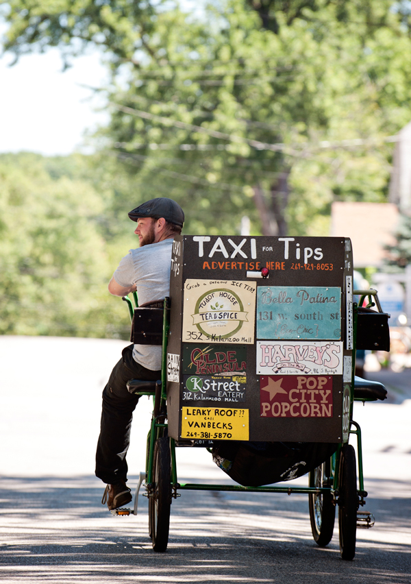 Bella Patina, Pop City Popcorn, Old Dog Tavern and Tudor Tea & Spice are just a few of the businesses that help keep Barber’s pedicab on the street. Main Street Cafe, Olde Peninsula, Harvey’s on the Mall, K-Street Eatery and Spirit of Kalamazoo also are supporters.