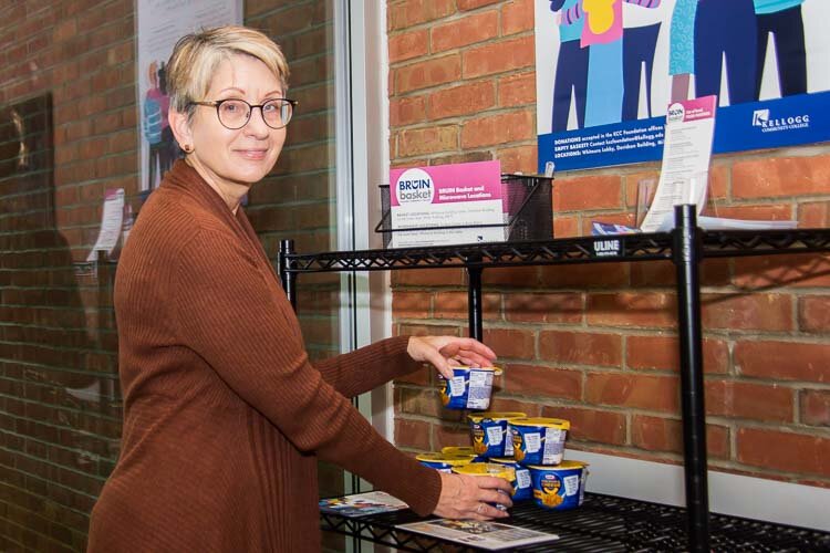 Hidden in plain sight inside buildings at Kellogg Community College are shelves and baskets containing non-perishable food items to be taken by students who experience food insecurity on a daily basis.