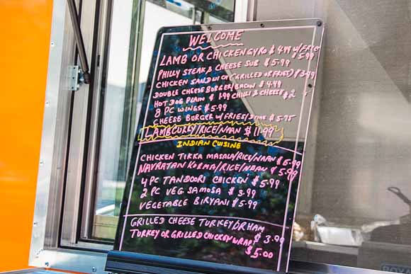 In addition to traditional Indian cuisine, his daily menu includes American fare such as hamburgers and a Greek gyro so that customers have more choices. So, on any given day the Indian side of the menu board includes two different entrees, a choice of Indian breads including naan, and two different appetizers. Giving customers the option of burgers or gyros will get them to his truck and may encourage them to try Indian fare, he says.