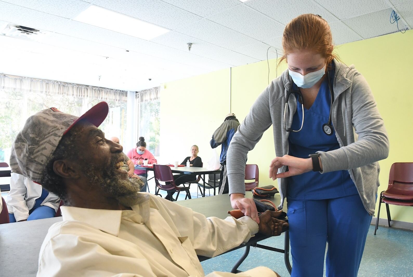 When not in use as a community meal site, the cafeteria serves as a destination for homeless individuals to access resources and services to have their basic needs met. They can secure a state I.D. and access vital records; receive employment and benefits coaching; get city bus passes; get laundry done; and get clothing, blankets, and personal hygiene items.