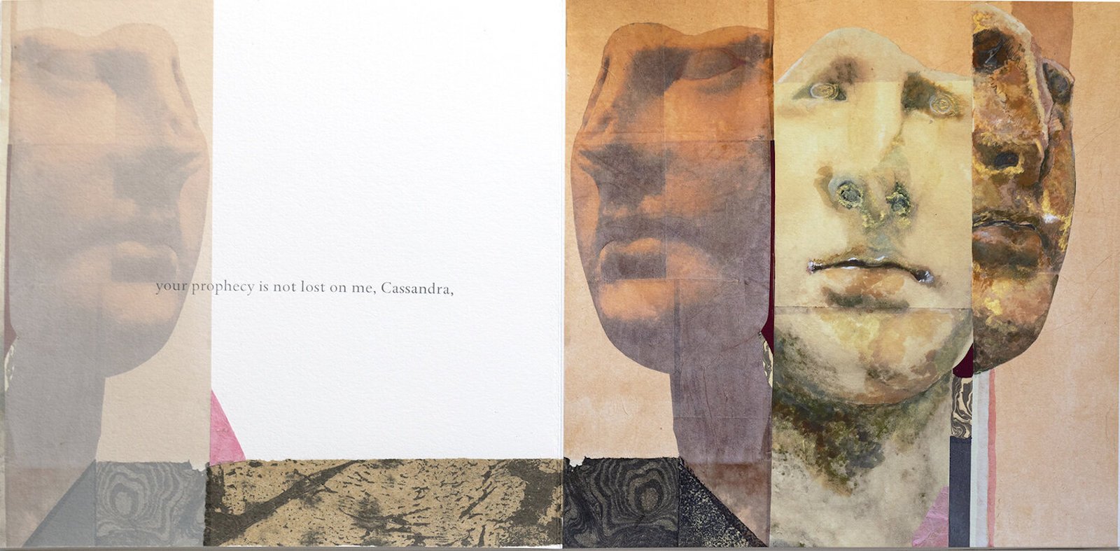 Courtesty of Kalamazoo Book Arts Center – Mary Heebner is painter and book artist whose work is often inspired by her international travel. CASSANDRA, A detail of one spread of the artists book Cassandra, showing additions of collage and painted embellishments.