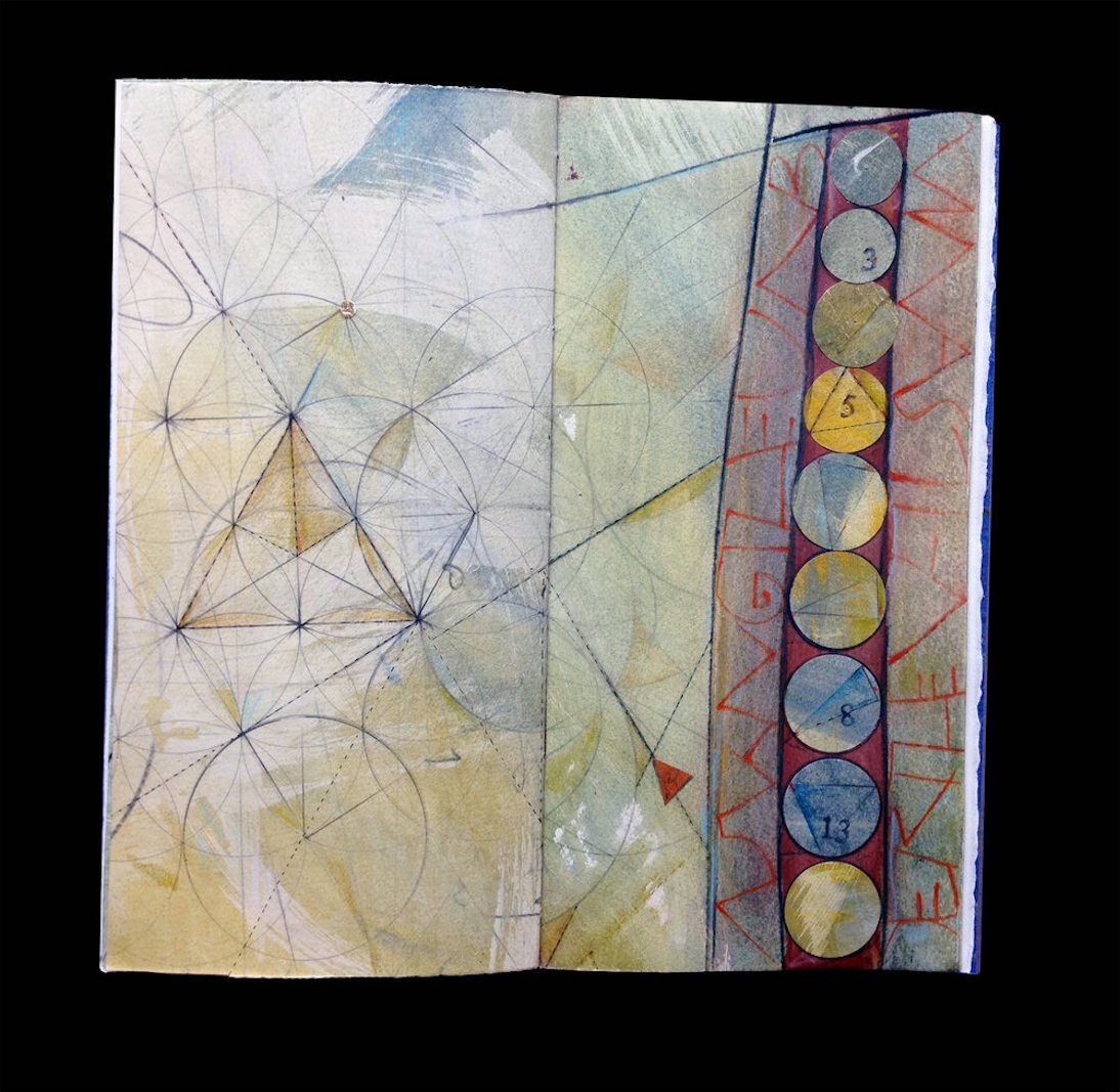 Courtesty of Kalamazoo Book Arts Center – Pamela Paulsrud’s exploration of energy and vibration, letters and lines, her love of the land, the earth and its resonance, inspires both her work and her life. This is Chaos Theory V, mixed media.