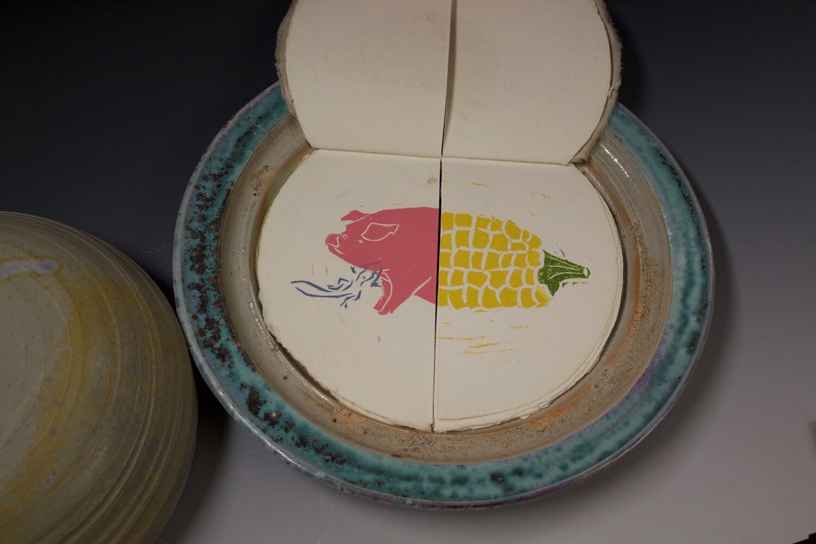 We can only see photos of featured works. Still, it’s evident that they are items of weight, substance, and texture: Shawn Sheehy’s pop-up paper art, such as his paper dragon with a pull-tab to make its wings flap, all look like they’re begging to be played with. Chad Pastotnik’s edition of Franz Kafka’s “In the Penal Colony,” with words printed in letterpress on fine paper, illustrated with wood engravings, linocuts, and intaglio prints, bound in tooled leather and housed in a drop spine box, looks like it’s made to last a couple thousand years. Andrea Peterson and Jon Hook’s “Mixed greens mixed genes,” unites arts by using Hook’s wood-fired clay that covers a dish containing a book by Peterson on genetically modified crops and livestock.