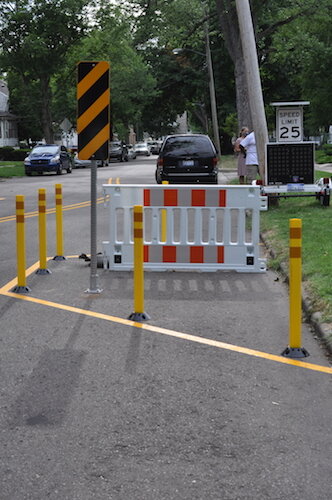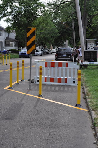 The chicanes that will be installed will be semi-permanent, consisting of a marked off area extending from the curb with flexible posts installed along the boundary. The city says this makes them cost-effective, more easily installed, and faster to implement than a concrete chicane or roadway redesign. It also makes it possible to adjust their location if necessary. Unlike other traffic calming designs like speed bumps, chicanes are easy for bikes and emergency vehicles to navigate.