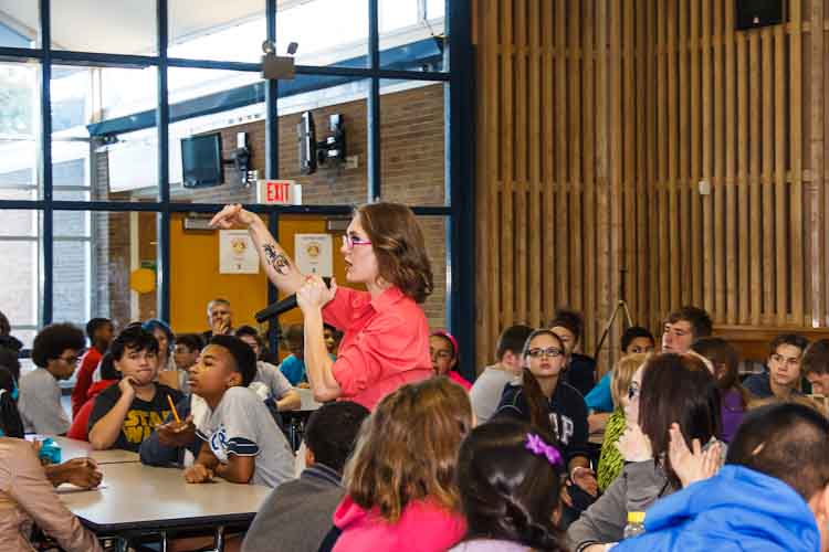Let’s be honest. Asking a cafeteria full of seventh-grade students questions like, “How familiar are you with black and Latina writers? What do you feel right now as far as how literature and the performing arts can affect society on a social justice level to really make a change?” could be an exercise in futility.