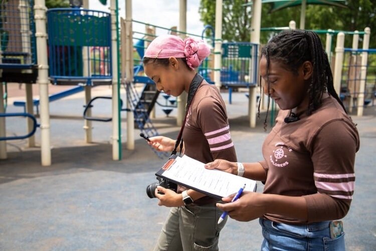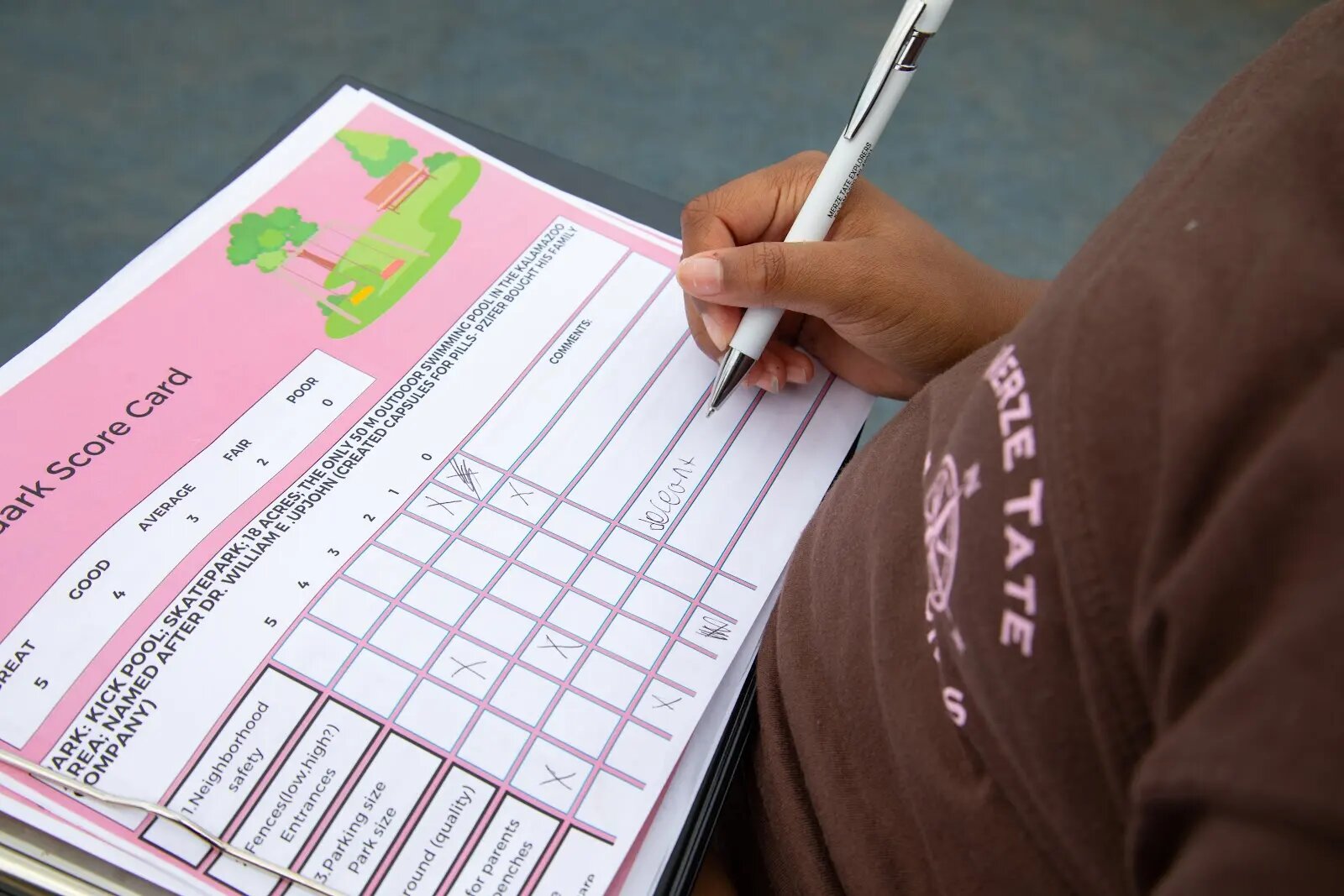 The Merze Tate Explorers filled in grids for each park they visited to generate a score for each one. A Merze Tate Explorer reporter fills out a park grade/scorecard.
