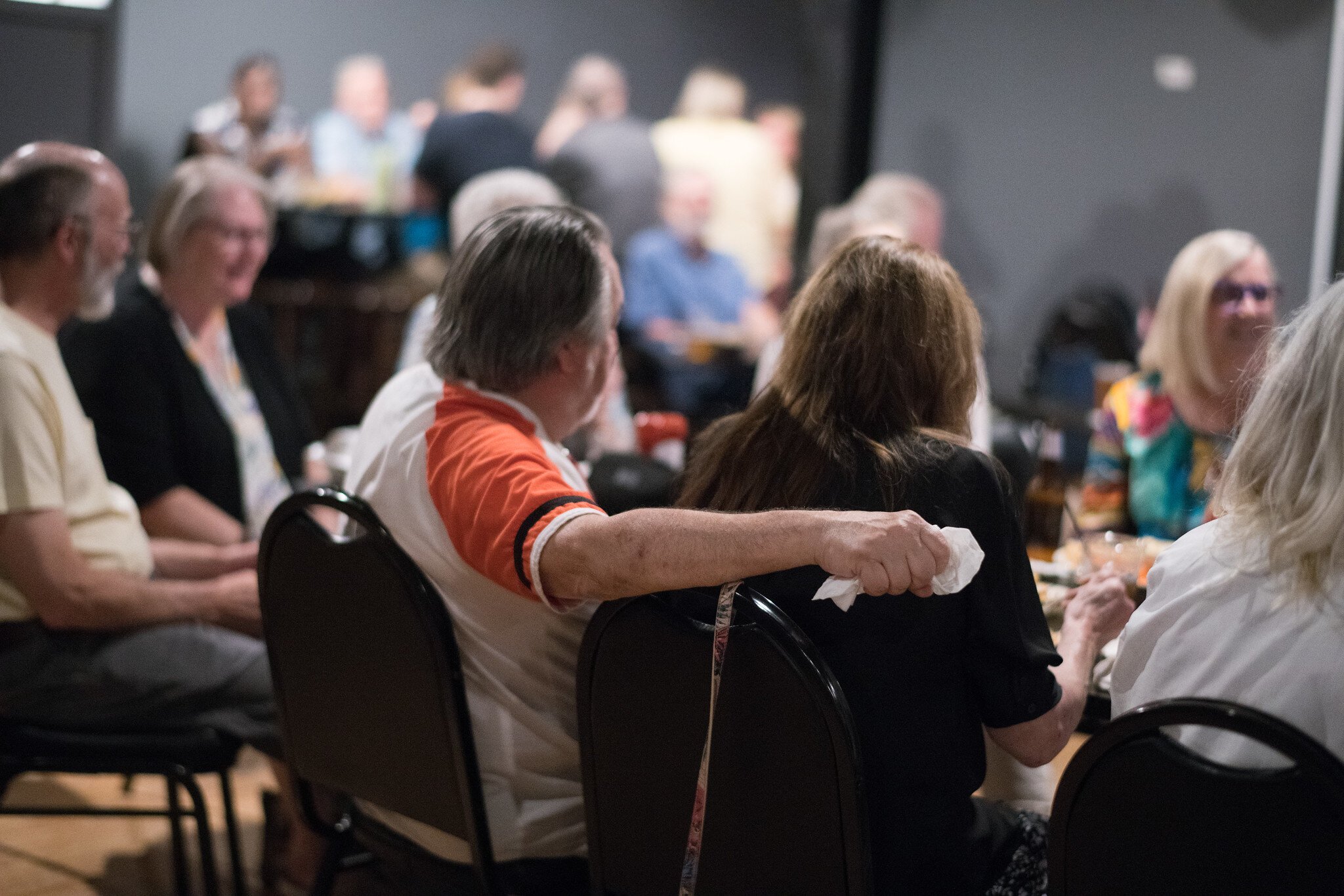 “Did you hear that screaming off stage? That was Judy Sarkozy coming in with all the people from Heritage,” Vestal says. They arrived via bus from Heritage Community. “They all come in as a posse.”