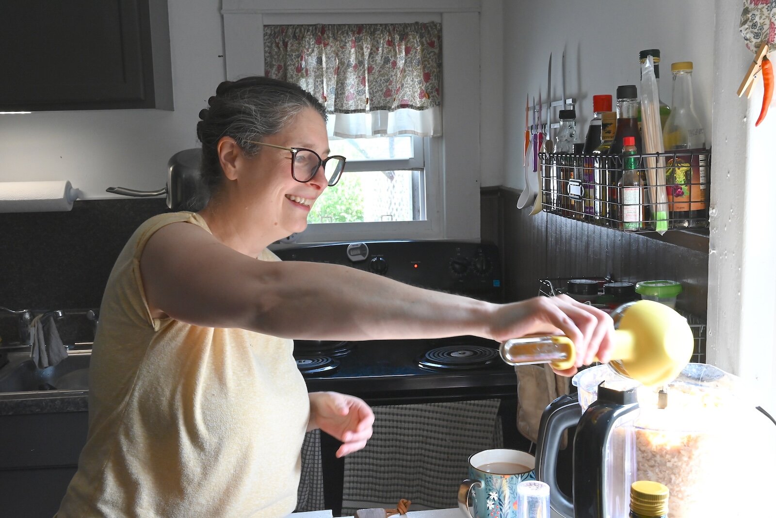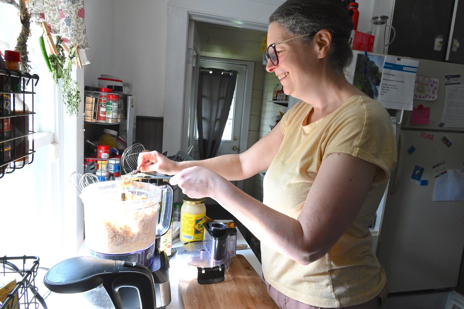 Stacey Kornegay pours lemon juice into the hummus she is making.