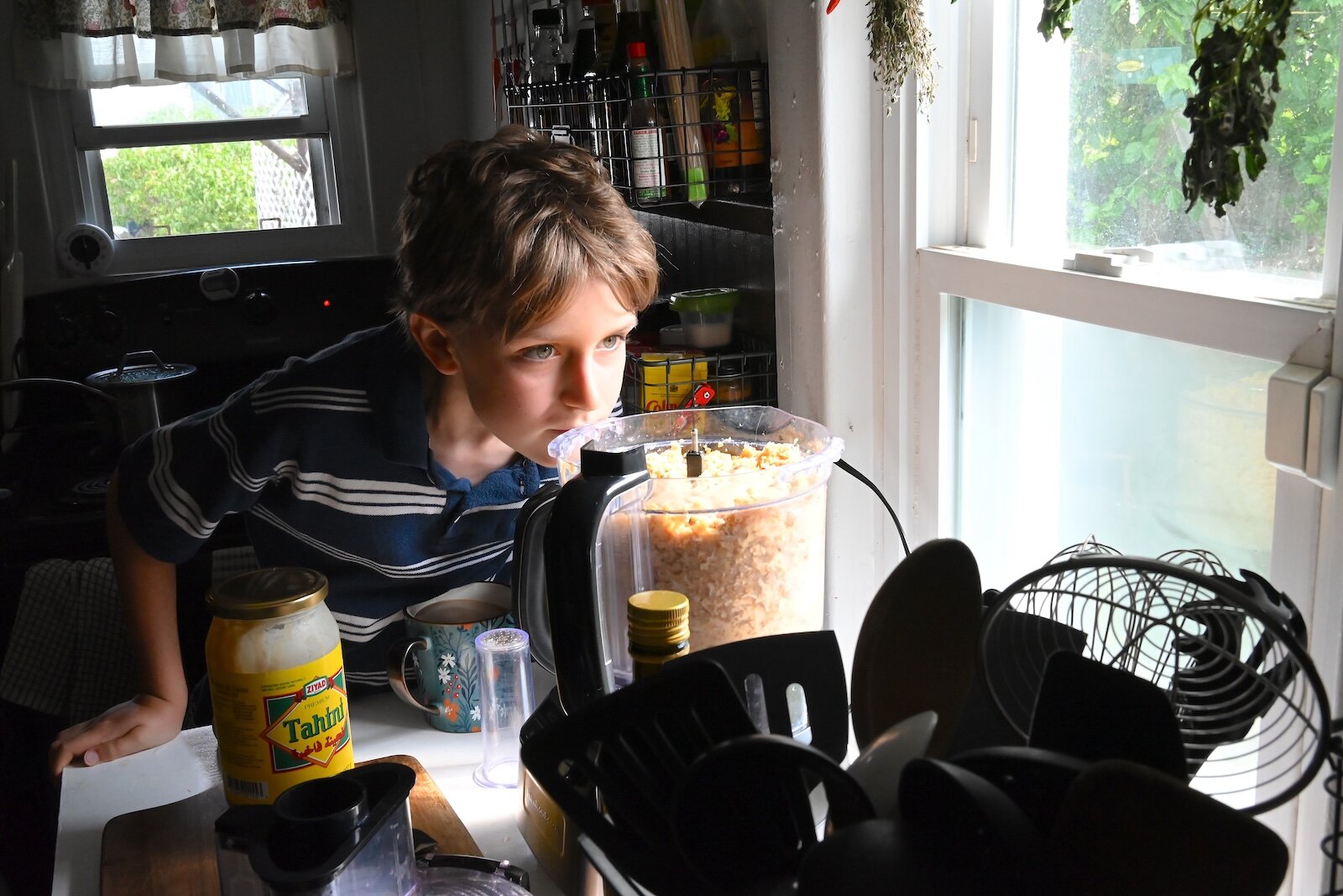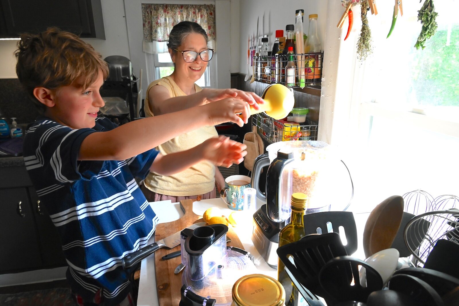Stacey Kornegay watches her son Liam squeeze lemon juice into the hummus.