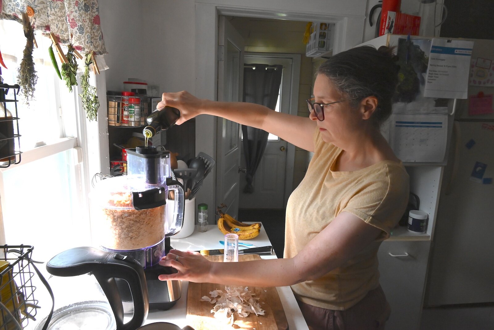 Stacey Kornegay adds olive oil to the hummus she is making.