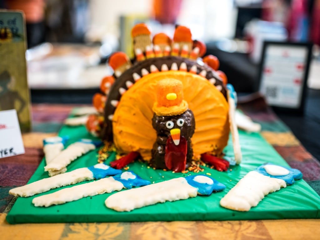 Smith was attempting to cut the turkey, serving up her and Marlatt’s winner to eager kids, while explaining it was three cakes, held it all together with frosting and plastic L brackets for shelving units. “It’s just a mess!” she says, cutting, but it held together during the voting.