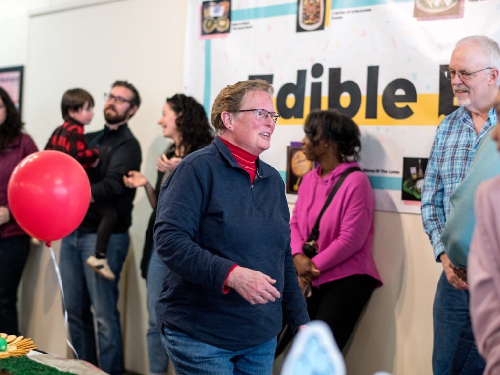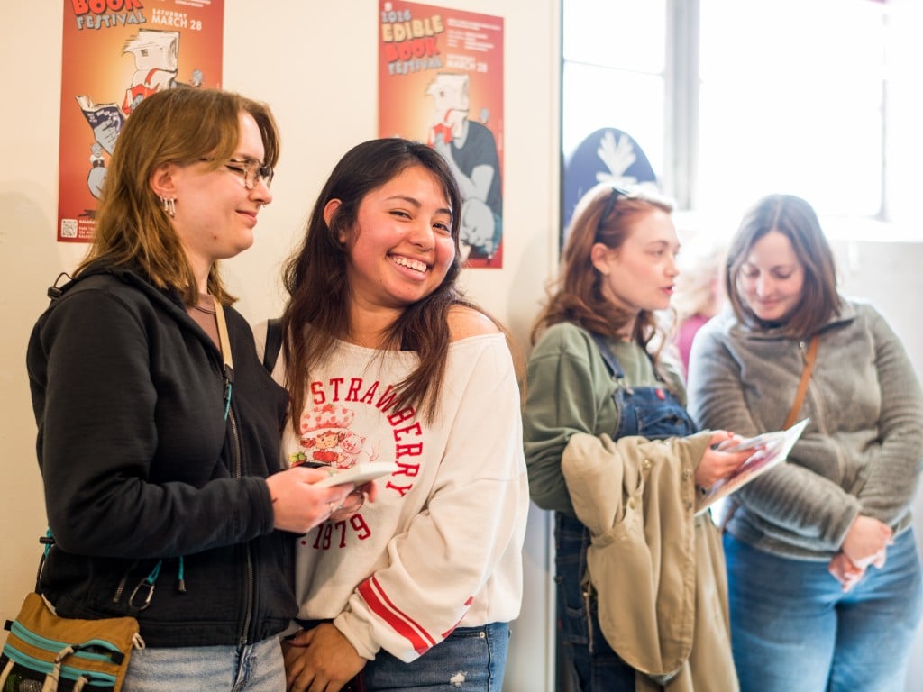 The 2026 Edible Book Festival took place on a Saturday afternoon, March 28. A large crowd of book-makers, book-bakers, and fans packed the display area at the Kalamazoo Book Arts Center in the Park Trades Center.