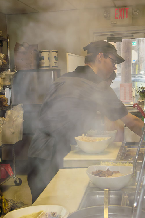 The restaurant seats about 16 and communal dining is the norm for those who eat-in. The majority of the more than 100 people served daily opt for take-out.