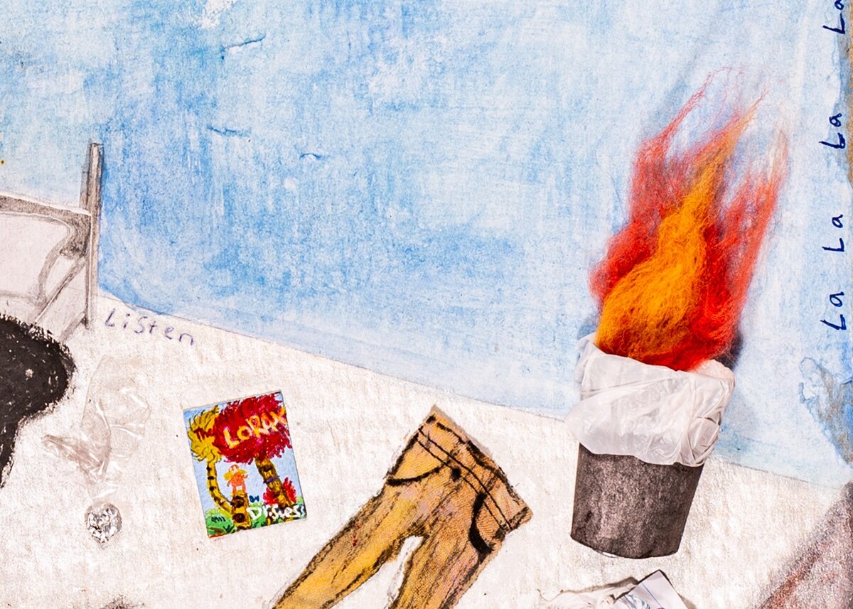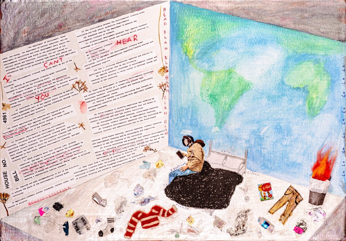 “I CAN’T HEAR YOU” is a piece I created to start a conversation on teens’ lack of awareness concerning environmental issues. The mediums consisted of cardboard and collage materials, felt, paint, and more. I thought it was important to portray a teen in their room who is sort of aloof and too focused on their phone to notice what is right in front of them. The walls are representative of Michigan State House Bill No 4961 which is focused on teaching skills relating to Environmental Literacy, Climate Change, and Healthy Lifestyle. This topic will always be important to me so thank you Voices of Youth for the opportunity to be a part of the conversation.