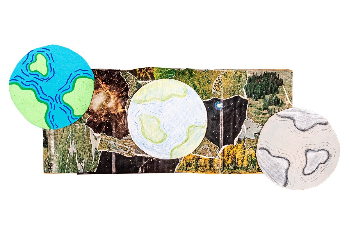 I chose to represent my focus on climate change through mixed media. I created the design on recycled cardboard using collage, colored pencils, and paint pens. To show the effect that humans have on the earth as the population and industry grow, I drew versions of the earth that appear to die a little more and more with each phase — each earth with less and less vibrancy.