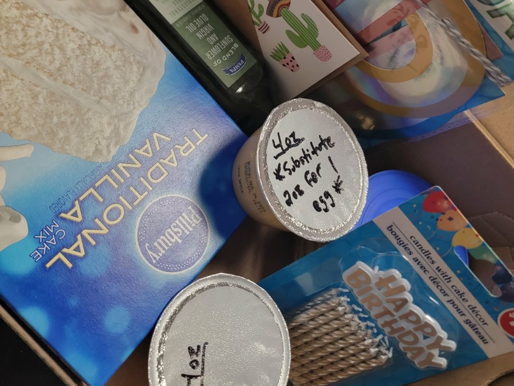 The shoebox-sized kits include cake mix, frosting, candles, applesauce to replace eggs, cards, and a banner. Walters also provides premade cakes for families with mobility limitations.