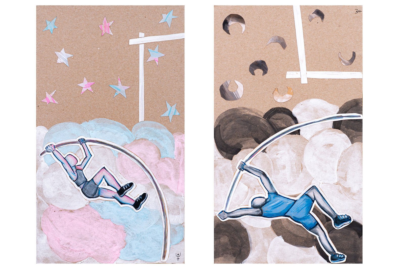 “In this piece, I specifically wanted to show how trans athletes have to do more work than cisgender athletes. I used colored pencils and watercolor on paper on an old cereal box to create the visualization of trans athletes having harder work to do than the cis athlete, since the trans athletes’ crossbar is so much higher. I’m not an athlete and am not trans, but I do know that we need to listen to the people whose lives these conversations affect. Instead of deciding what we think is best, we need to let trans athletes be their own voices.”