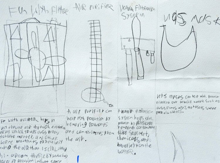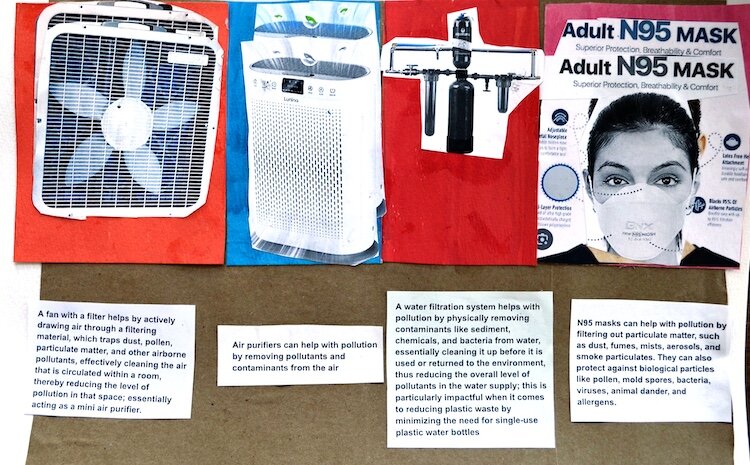 Artist Statement: I have always enjoyed working with my hands with pencils, markers, and glue. I like having to use my imagination in order to create something. My focus area was how to protect yourself from pollution in Kalamazoo. I did research on different types of filtration devices and made a collage for it.