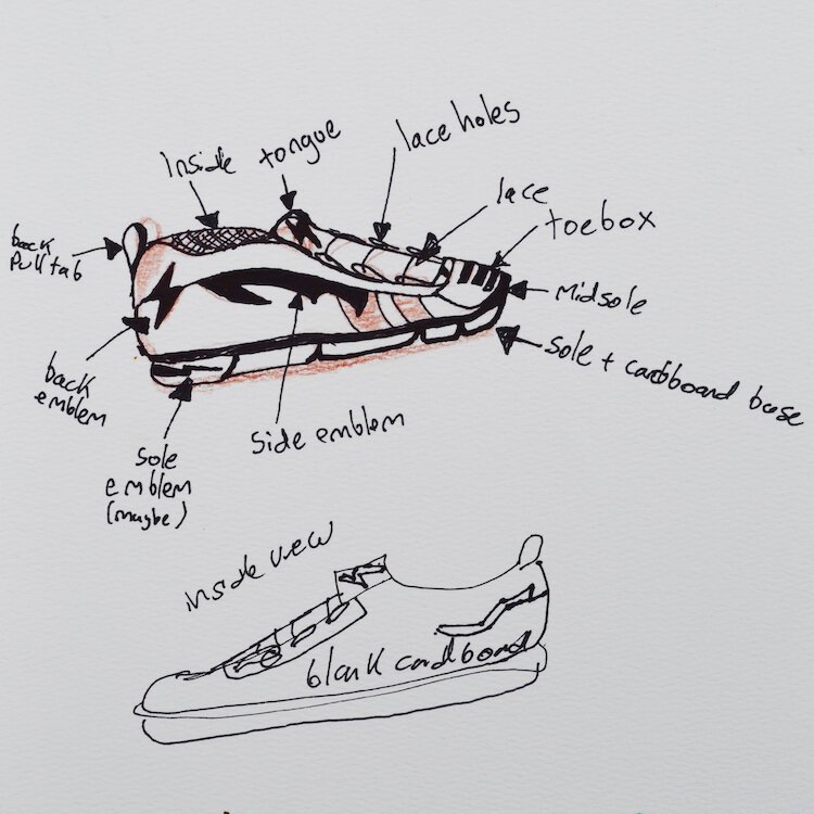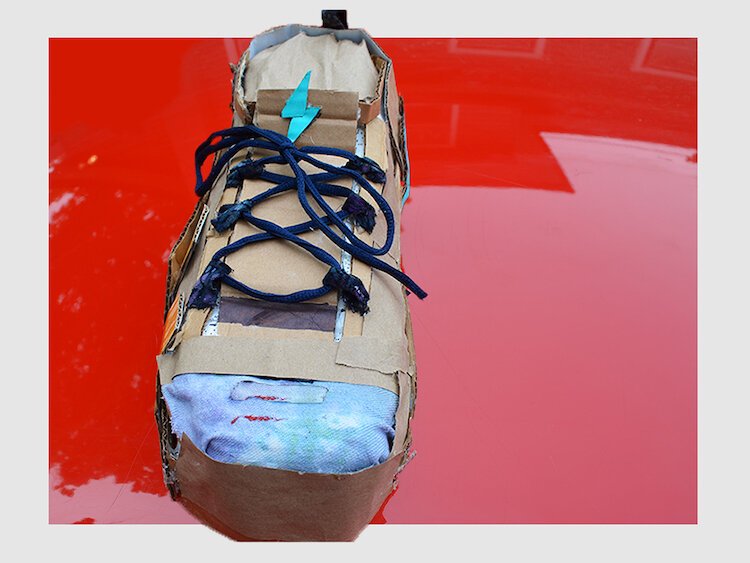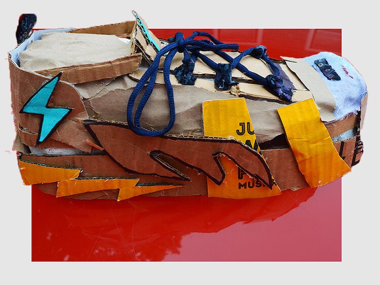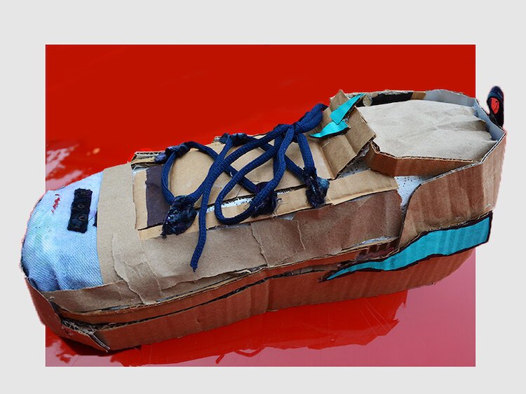 “I am working on concept shoes for Voices of Youth, representing the topic of The Impacts of Fast Fashion. I wanted to represent packaging materials that are often not recycled by using these same materials to create my sneakers. I used hot glue and plaster paper to create the shoe, and some colored packing materials and acrylic paint for accents.”