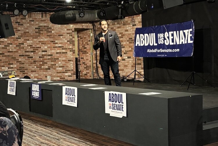 “My name is Abdul, and I’m running for Senate because I was told my name would look perfect on a ballot,” Dr. Abdul El-Sayed jokes as roughly 200 people listen.