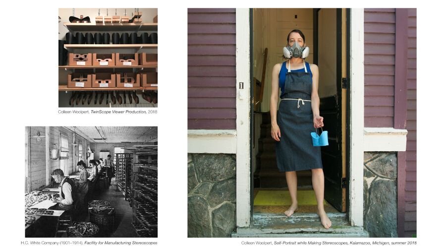 She is also an inventor. Woolpert invented the TwinScope Viewer, a hand-held device used to see stereograph images in public exhibits. Stereographs are side-by-side pairings of two slightly different photographs or images to provide a three-dimensional experience. Extremely popular from 1850 to 1930, they were used to capture lots of scenes from long ago. Woolpert has used the TwinScope Viewer to exhibit her own contemporary stereographs.