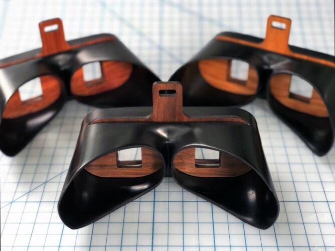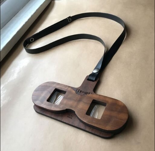 She makes each viewer by hand using laser-cut hardwoods, glass optics, and pressure-cast rubber (for the binocular-like eyecups).