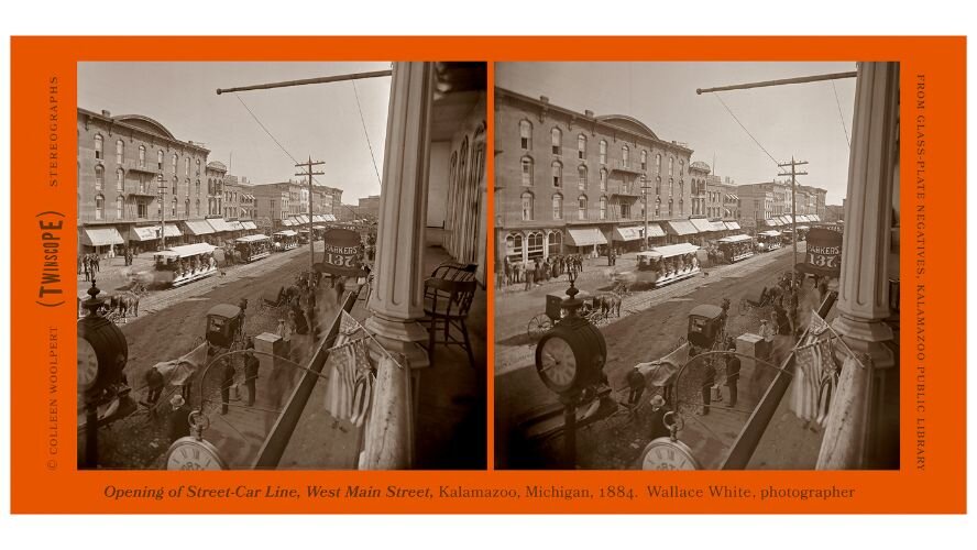 In 2000, Woolpert discovered and fell in love with stereographic images when she found a stereograph viewer at the Kalamazoo Antiques Market. It brought life to images from the past she says. Since then she has learned that although stereograph images are created in pairs, many have been shown as singular images because a viewer for public exhibits is not always available.