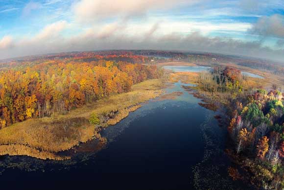 A sandhill crane’s-eye view of the Smith property provides views of Little Gilkey Lake stretching north to Shallow Gilkey Lake, now permanently protected with a conservation easement. Photo by Nate Fuller.
