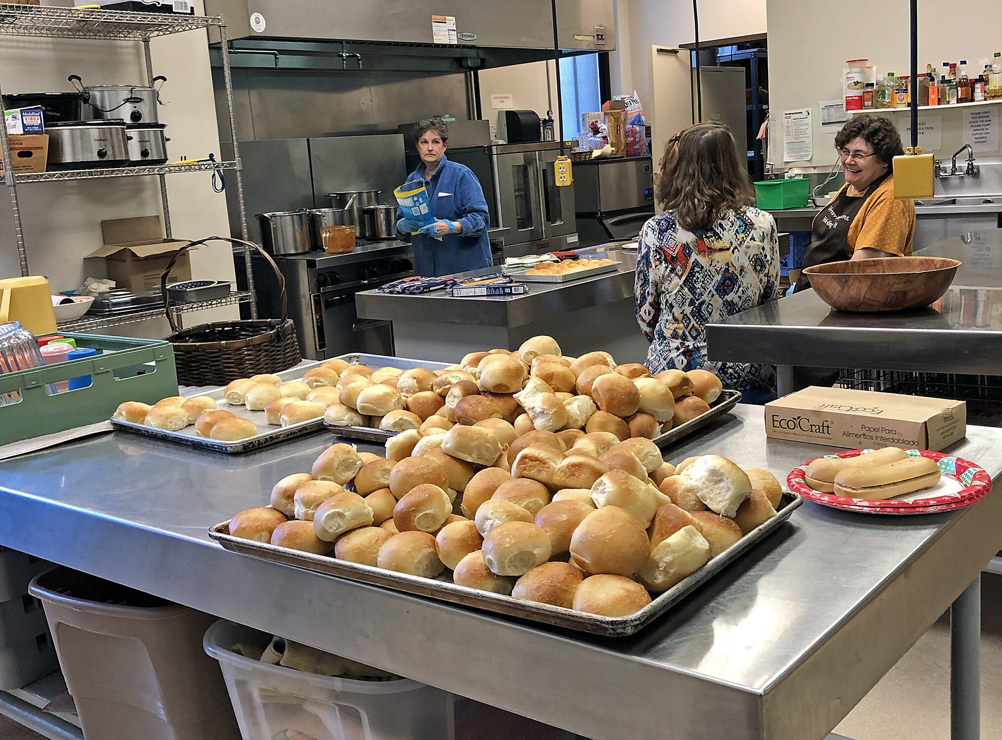 Mike Wenninger – Volunteers prepare food in the kitchen of First Presbyterian Church.