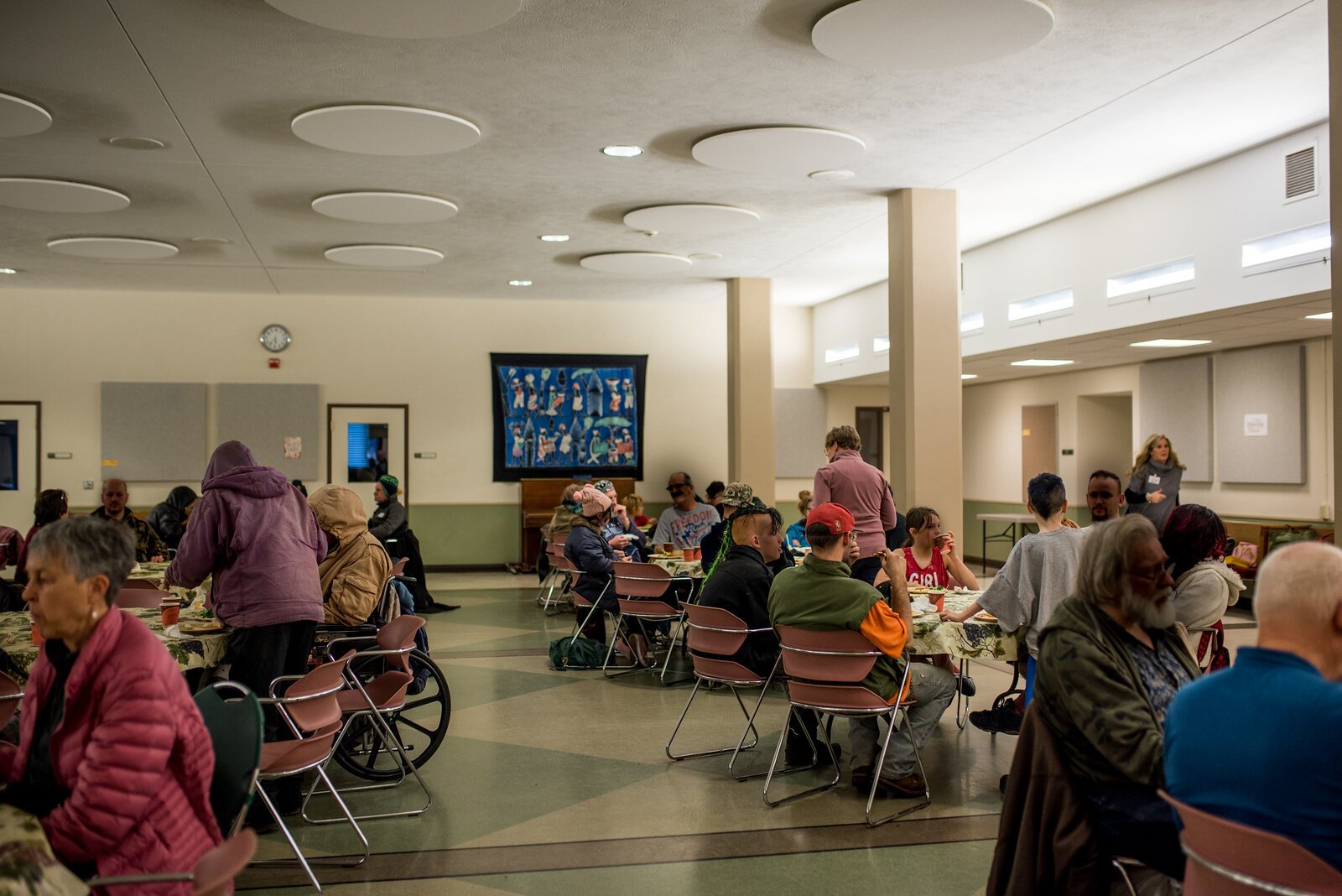 Starting at 5 p.m., up to 100 mostly unhoused people enter the church’s pleasant dining room through the parking lot’s red doors to enjoy a hot entrée, vegetables, salad, rolls, dessert, and coffee. Everything is free and is prepared by about 15 enthusiastic volunteers, most of them members of the congregation.