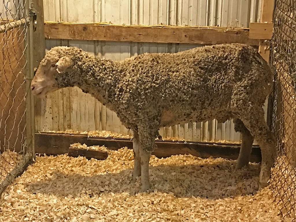“We received a call from a concerned woman who was buying a house on a nearby lake, and this sheep was wandering in her yard,” Chris says. “We were told this sheep was very scared of people. We captured her, and she was beyond thin — emaciated. The wool that covered her sunken sides was thick with burrs, matting the wool together. Her hooves were wildly overgrown, each side curving up and out. Her left ear was a drooping, swollen mess, torn and bleeding from where a tag had ripped out of it. Down her back was spray paint, most likely a cull mark, to designate her as an animal with no additional value except for slaughter.”