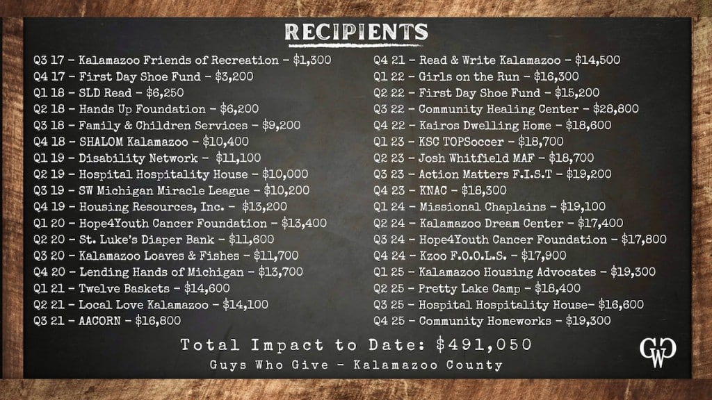 The gift is an accomplishment that puts Guys Who Give about $10,000 shy of $500,000 in quarterly contributions to local nonprofits since the group was started in 2017. “So certainly at our next quarterly event, we’ll hit that celebratory mark,” Livingston says.