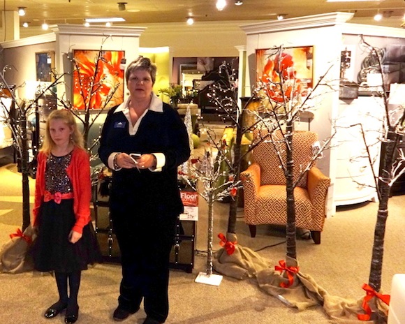 Pictured: Michelle Davis, executive director of HRI, announces progress to date on Project Home For The Holidays during a reception on Nov. 19. With her is Kailynn Mejeur, 8, of Parchment, who raised $101 for the project by selling hand-made paper snowflakes with candy bars.