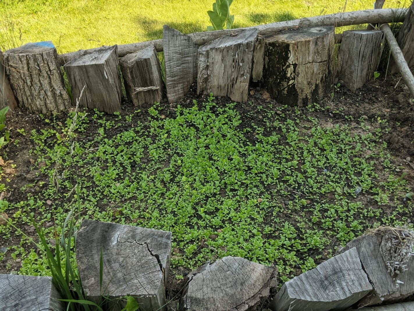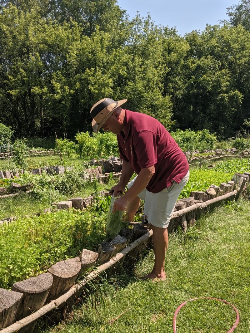 His hands are his machinery and everything he uses comes from the land. The split logs used to make the raised beds come from trees growing on his property as does the dirt, peat, and topsoil where the plants take root after he digs holes in the grass for them.
