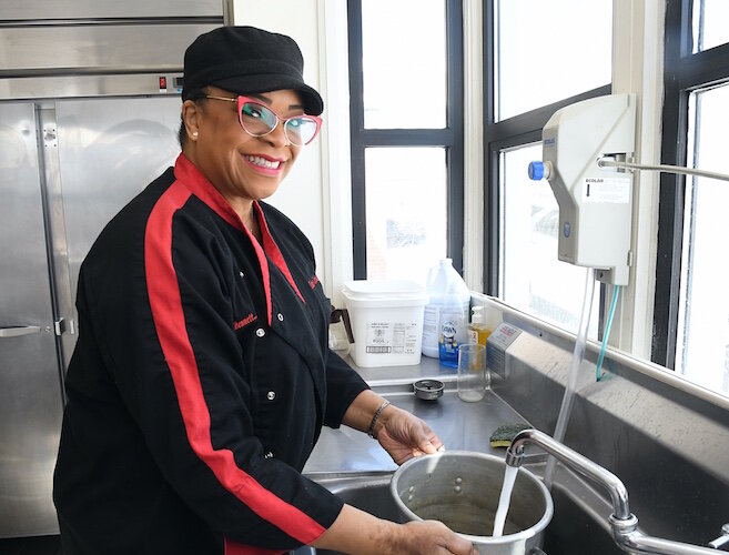 John Grap – Kimberly Bennett, owner of Taste-A-Licious Catering, works out of the kitchen at Battle Creek’s First Congregational Church in Battle Creek.