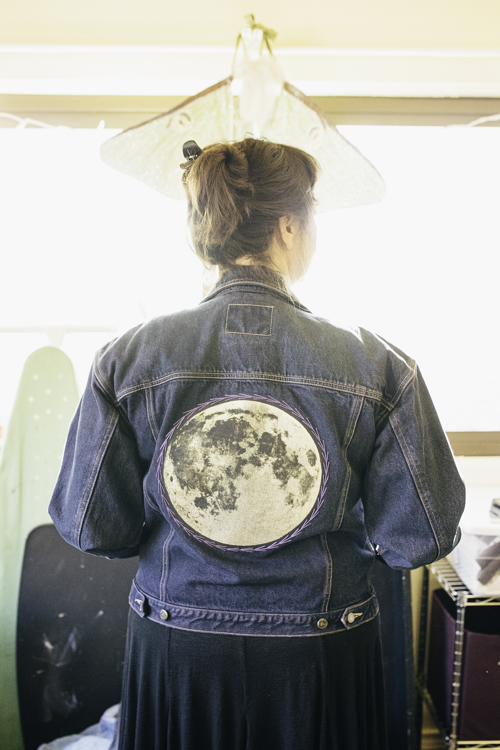 These days, accessibility and affordability play a key role in Agopian’s current works, which focus on wearable art, such as headbands and jewelry, and screen printed images. To create the pieces, she combines elements she loves working with: collage, photography, vintage ephemera and images from the natural world. She has created a series of earrings made of a waterproof paper that feature her own designs; some of her other items include hand-drawn fabric leaves and fabric bunting bearing phases of the moon.