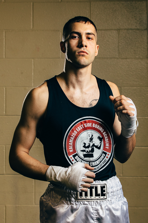 Eric Hennig, VAGUE photography – Alex Johnson of Kalamazoo Eastide Boxing gets in the zone before his match Feb. 16 at the Kalamazoo Eastside Boxing Show.