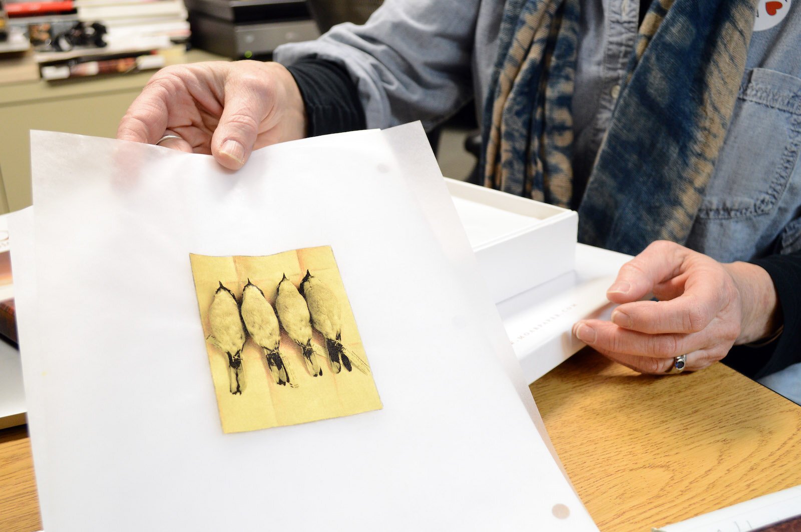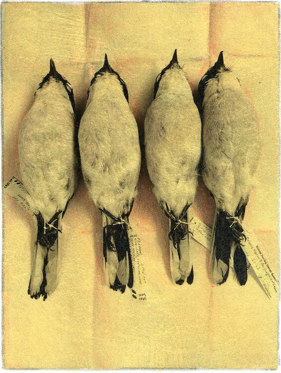 Many of the photos in her project, still in the works, are black and white digital shots printed on vellum, hand-colored and backed with gold. She’s spent the winter shooting taxidermied bird specimens in the collection of the University of Illinois and transforming them into art. “I imagine these specimen images to be small and rather precious, but also, too, the gold gives them a dimension.”