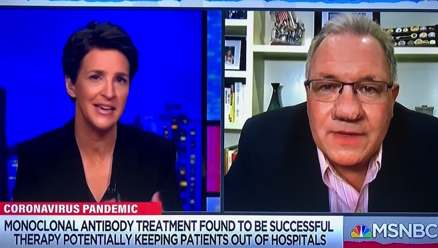 His appearance highlighted a program segment in which Maddow asserted that the United States has two “exit doors” to escape COVID-19. One is mass vaccinations, which includes overcoming some people’s skepticism and hesitancy to become inoculated. That is widely known and vaccinations have been heavily promoted for months. The other, which far fewer people have heard about, is the use of monoclonal antibodies, she said, “So if you get COVID, you won’t get sick and die from it.”