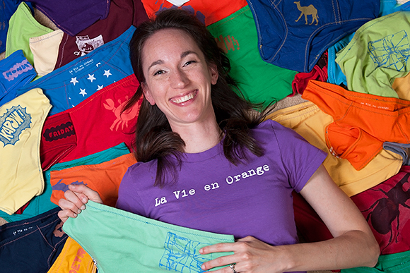 La Vie en Orange is Jock’s business of making recycled underwear, underwear she makes out of favorite old cotton T-shirts. That shirt you’ve been wearing since college, worn as your favorite pajamas, worn while doing yoga or jogging, worn around the house, suffered through stains and a thousand washes, maybe even used as a dust rag–now, in the hands of Kori Jock, can be reborn as your favorite pair of undies.
