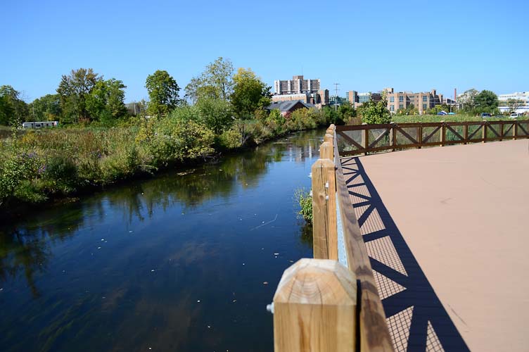 In spite of roadblocks, portions of the connection have been completed: two blocks along Kalamazoo between Porter and Edwards Street, lengths along Arcadia Creek to Westnedge Avenue, Westnedge to the west leg of the KRVT. The trail will also make use of paths through the Arcadia Festival Place and Kalamazoo Valley Community College’s Arcadia campus.