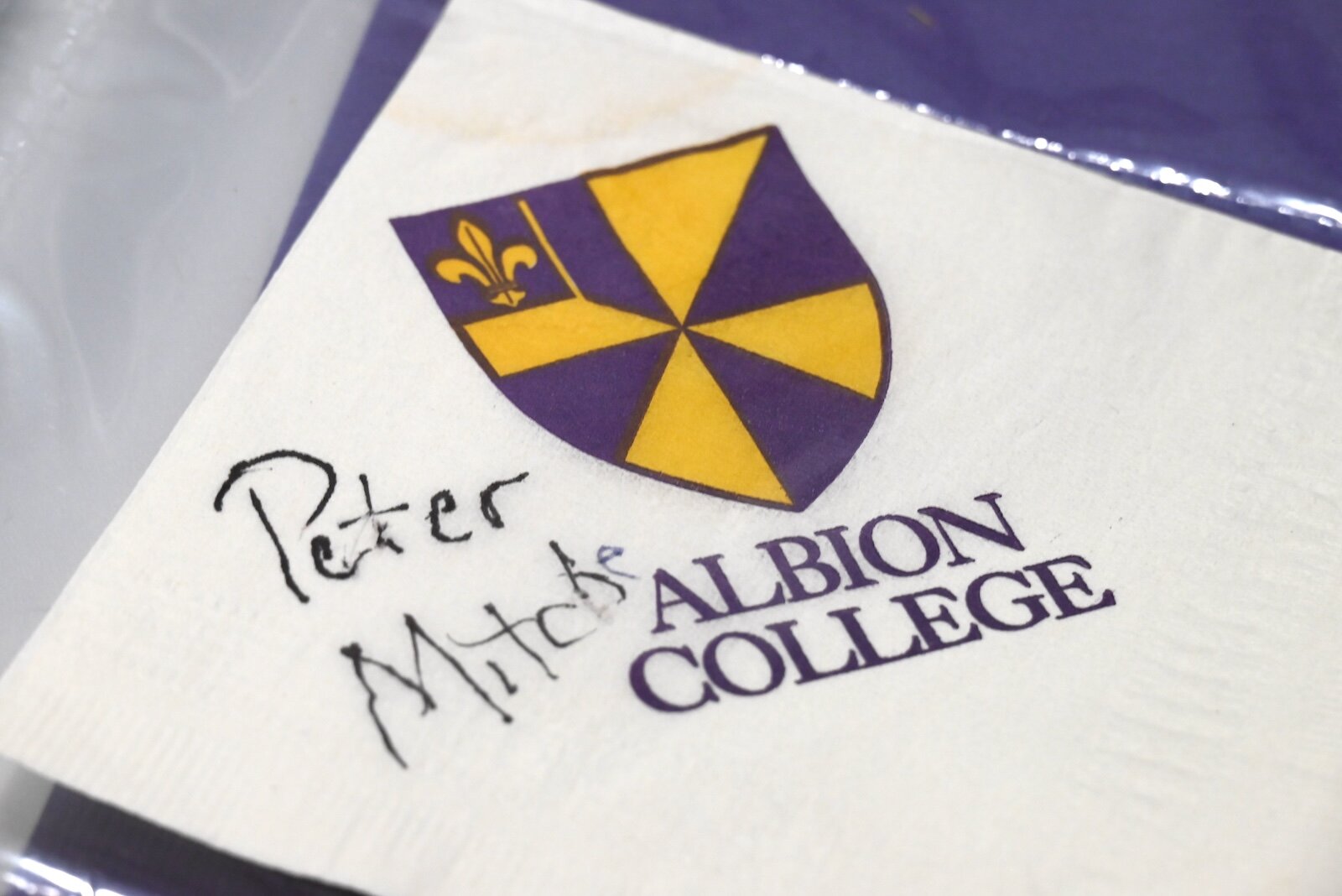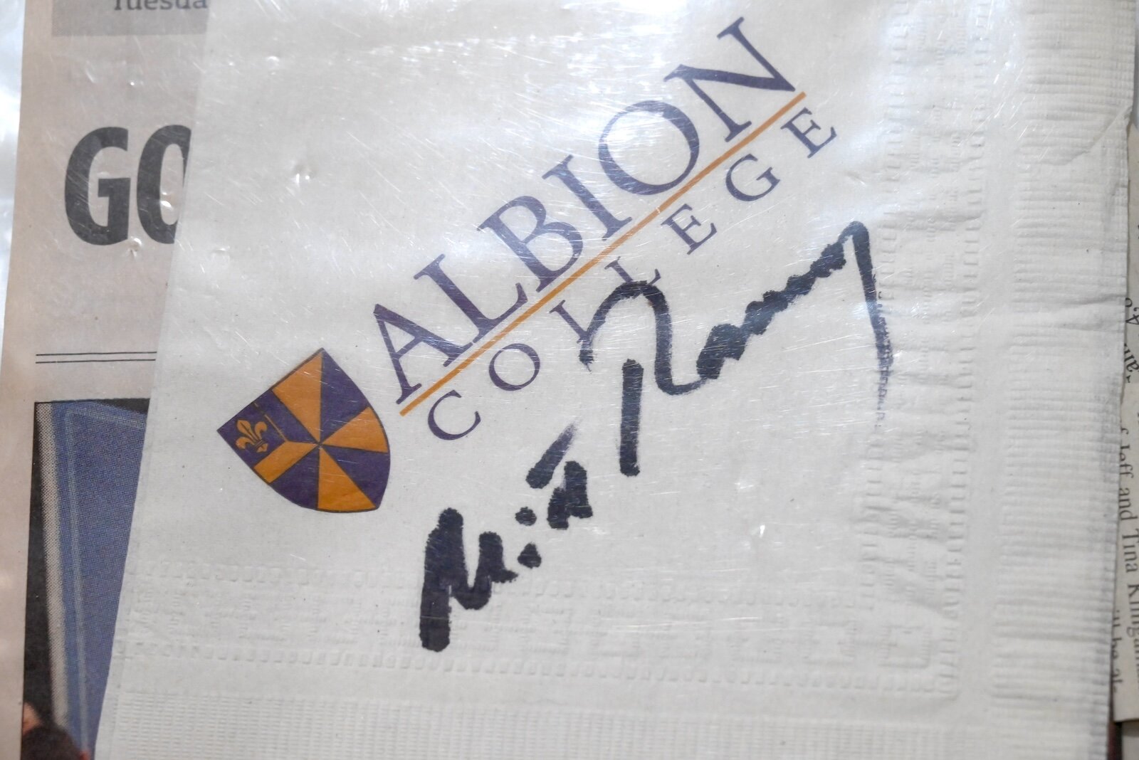 A napkin signed by children’s book writer and illustrator Patricia Polacco