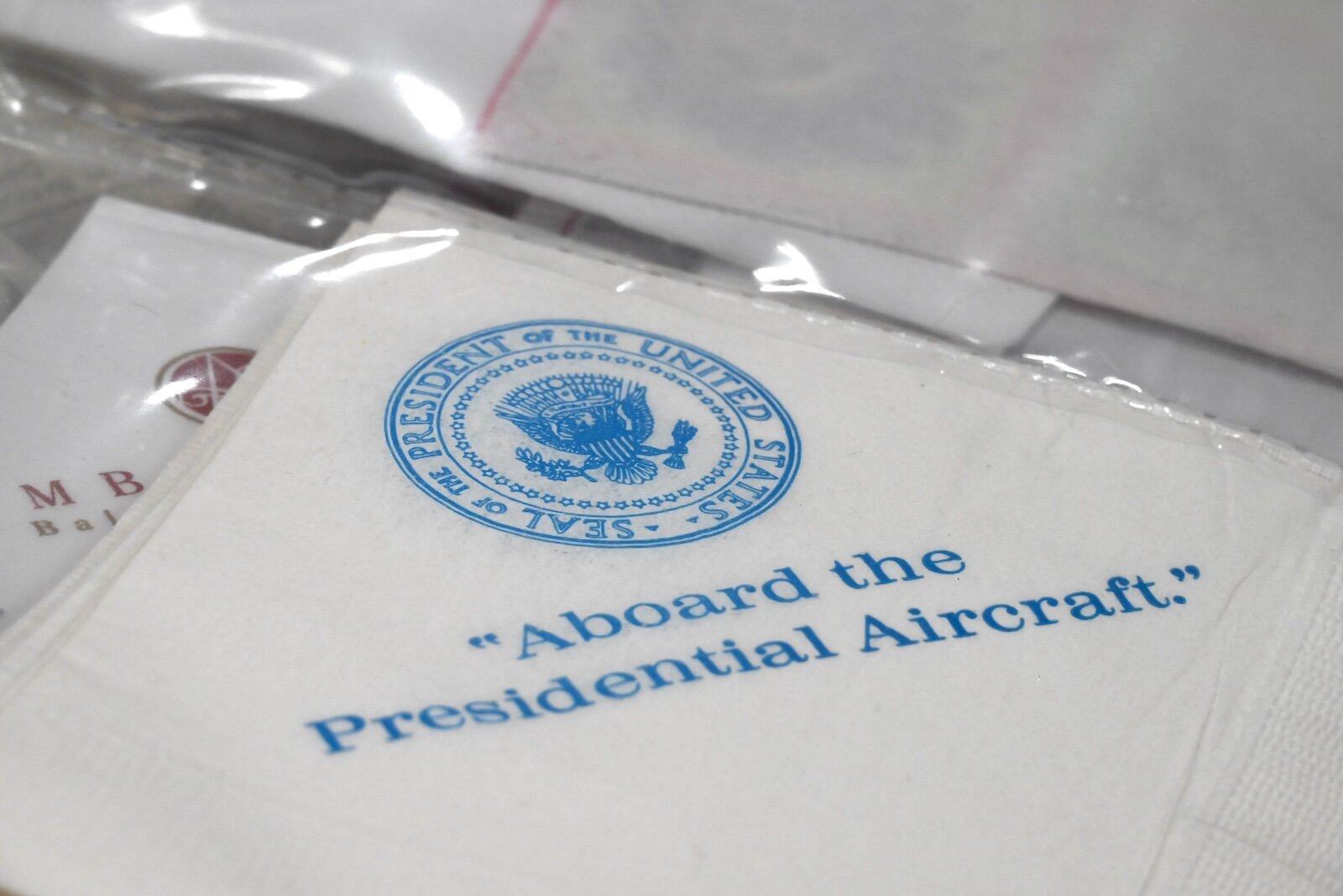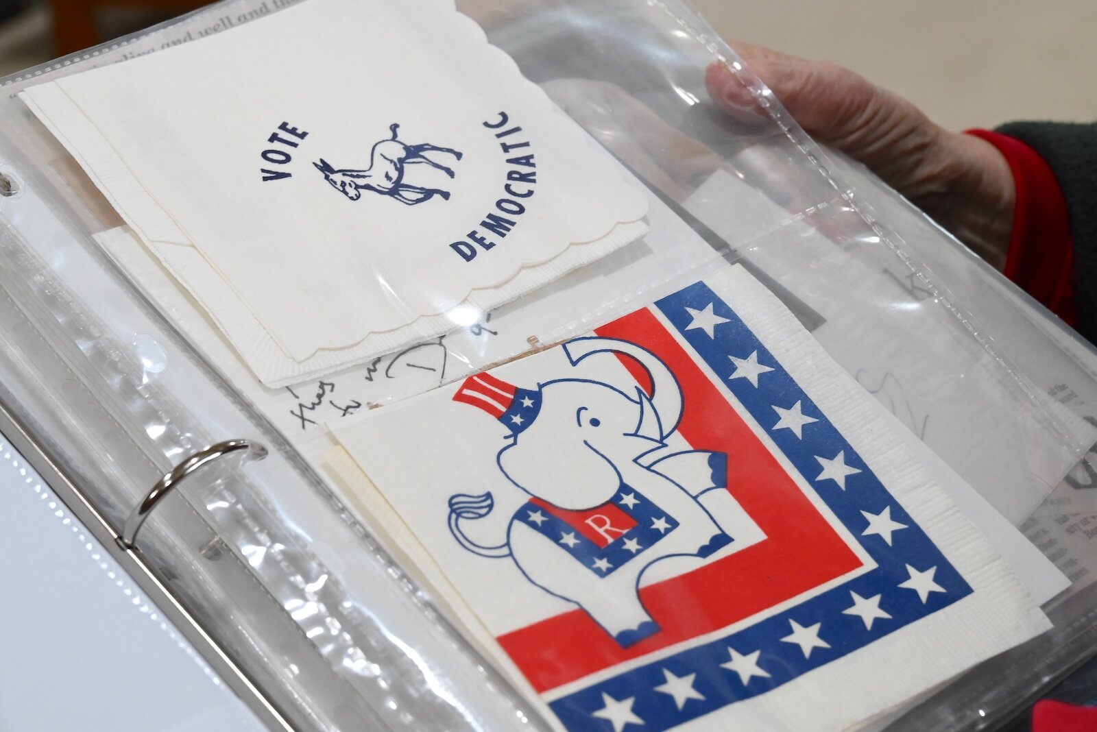 “Anybody who knows I collect them still collects them for me,” she says. “I have a lot of napkins from airlines no longer in business and politicians and when I go to church people will hand me a napkin.”