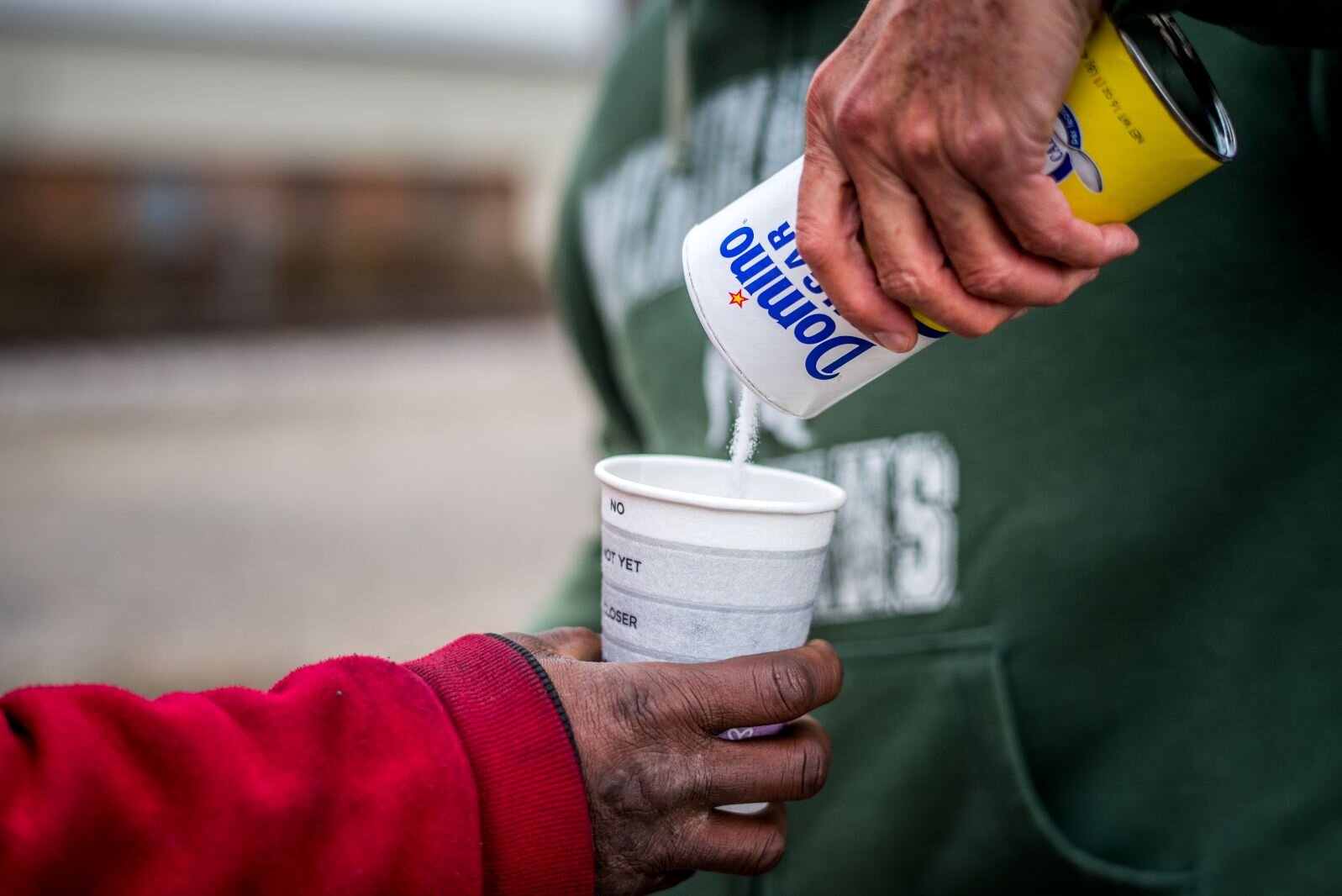 Van Schaik walks back to his car to help someone find a sandwich. Hirsch says, “He’s amazing, this guy. I’m more of the one-on-one relationship-building work. He’s out here doing things I’ve never done.”