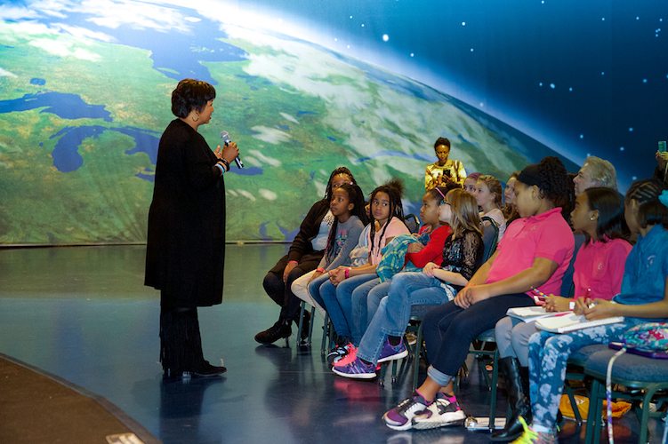 In addition to her address before the community, Jemison met March 24 with about 40 students, ages, 9 to 13, in a Q&A session in which she talked about her experiences as a student, a woman of color, and as a scientist. Students questions ranged from those of technical curiosity (how long does it take to get to space) to the personal (what was your first job and how did you prepare for your future).