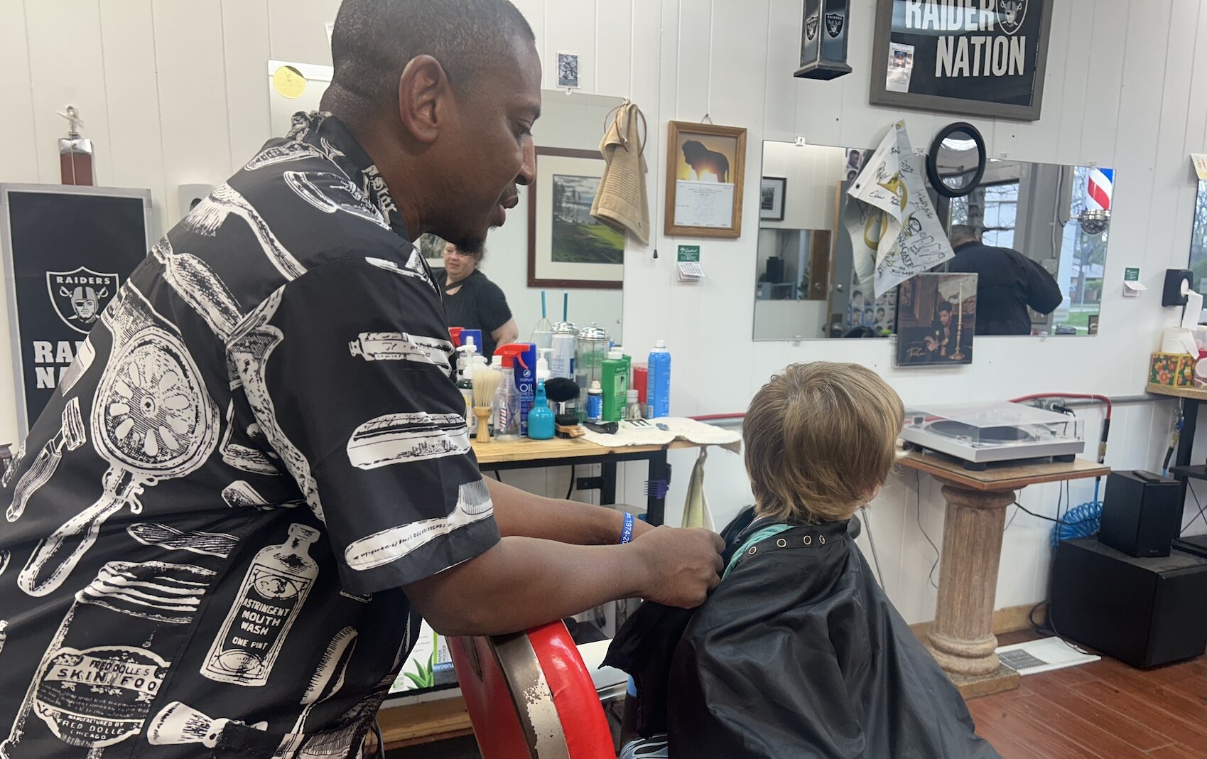 A young boy gets his haircut by Robert DeAnda, owner of Rob’s Barber Shop during a Barbershop and Literacy event in the Vine Neighborhood.